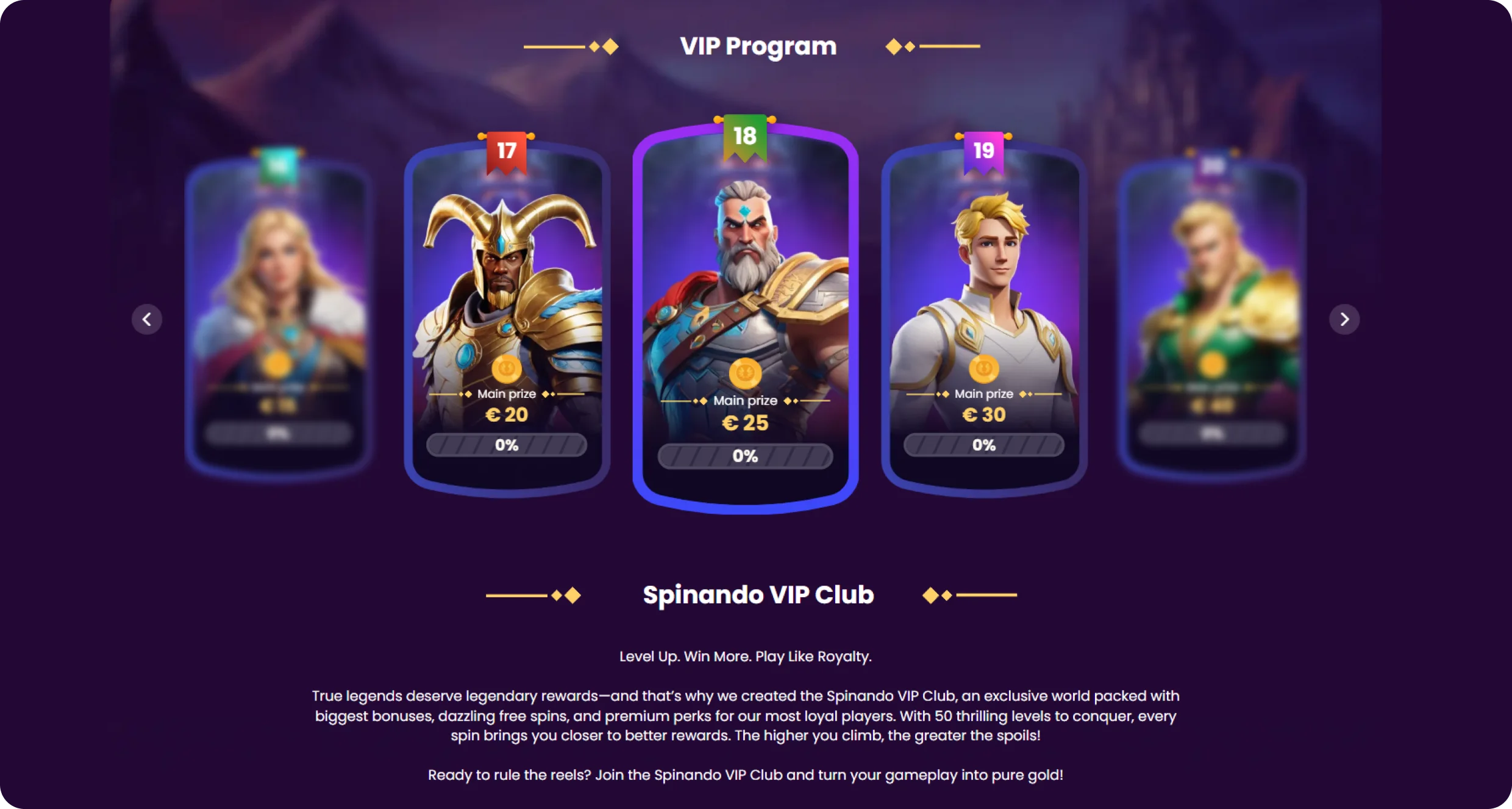 Spinando Casino nabízí štědrý víceúrovňový bonusový systém přizpůsobený českým hráčům. Od první registrace získáte silný balíček vkladových bonusů a následné pravidelné reload akce, které udrží vaše herní konto v dobré kondici a hru stále zábavnou. Všechny bonusy jsou uváděny v eurech (€) a také hráči používající kryptoměny mohou těžit ze stejných výhod.