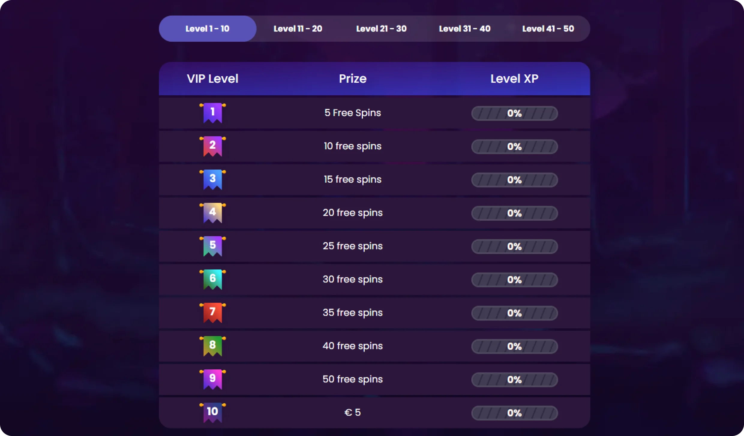 - VIP systém s 50 úrovněmi, volnými spiny a hotovostními bonusy