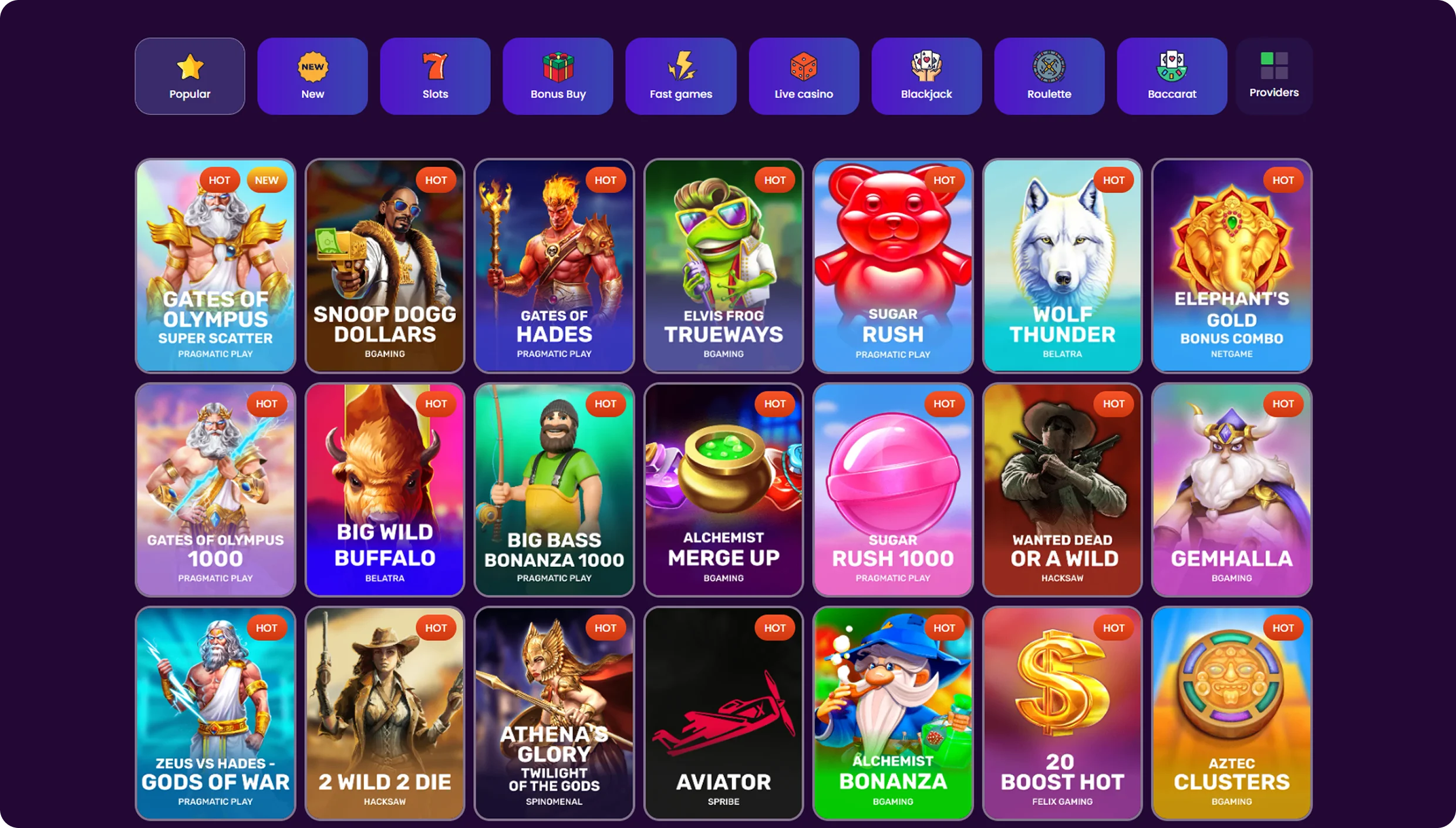 | Vývojáři her | Pragmatic Play, Evolution, BGaming, Betsoft, Red Tiger, NetEnt, Ezugi, Quickspin, Play’n GO, Push Gaming, Yggdrasil, Endorphina, Playson, ELK Studios, Habanero, Spinomenal, Nolimit City, Thunderkick a další |