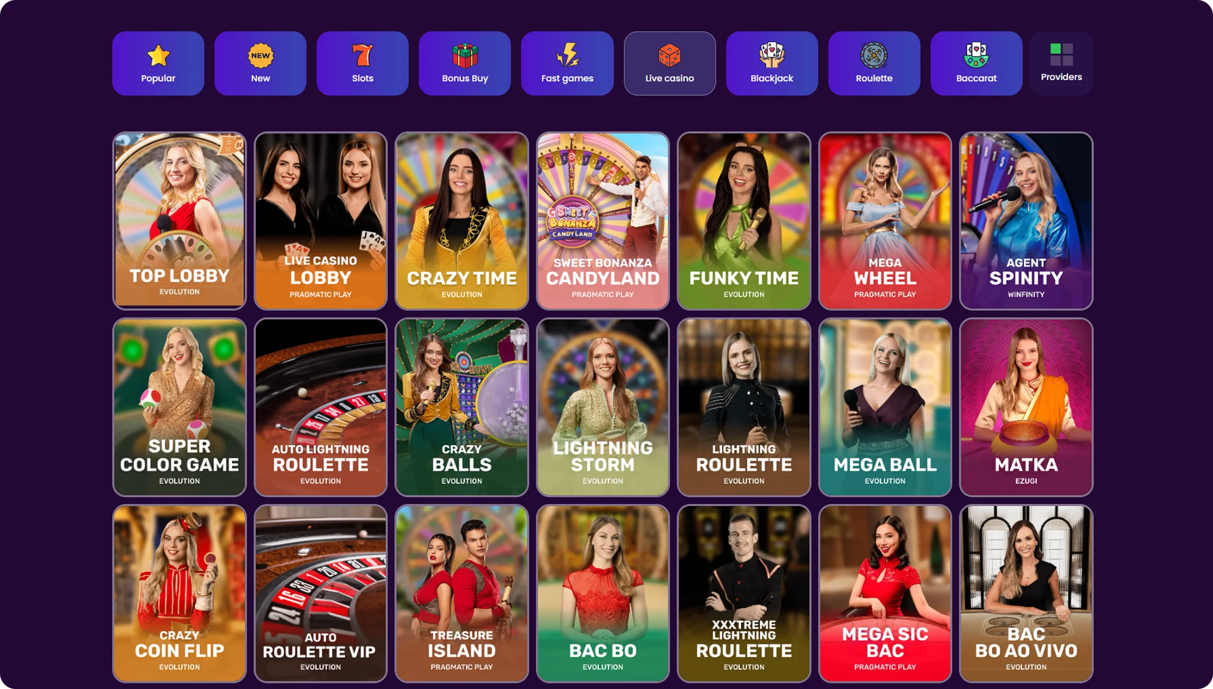 - Game show tituly: Crazy Time, Sweet Bonanza Candyland, Mega Ball, Crazy Coin Flip